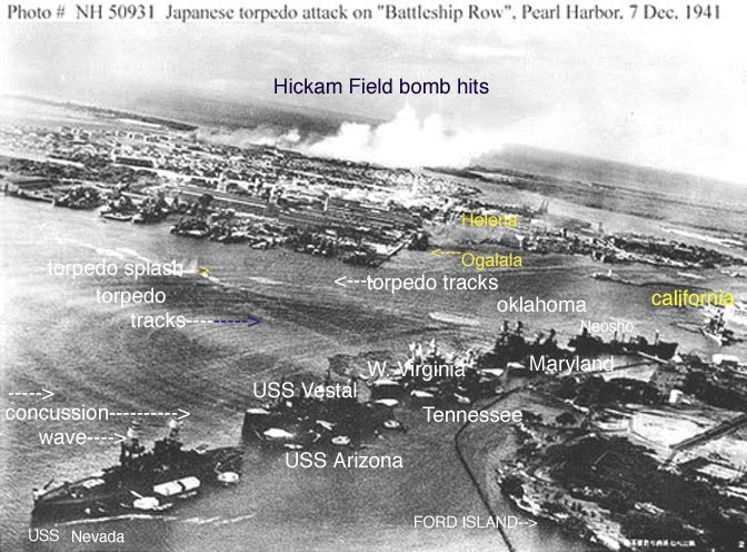 A fast pic of her after turret tops after settling in the mud show her as "dark" compared to the sailors "working blues" in this pic. A much darker shade of paint then what she was photographed in just months prior to Dec 7TH 1941.